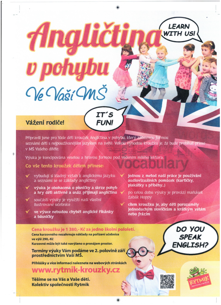 Mateřská škola pouze zprostředkuje nabídku. Tato nabídka platí pro děti z obou budov naší mateřské školy (Drahanovice i Ludéřov). Z prostorových důvodů však firma bude realizovat kroužky v budově MŠ v Ludéřově.