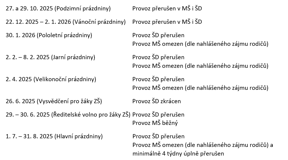 ředitelka školy projednala se zřizovatelem a rozhodla o následujících změnách v provozu v době prázdnin v základních školách ve školním roce 2025/2026: