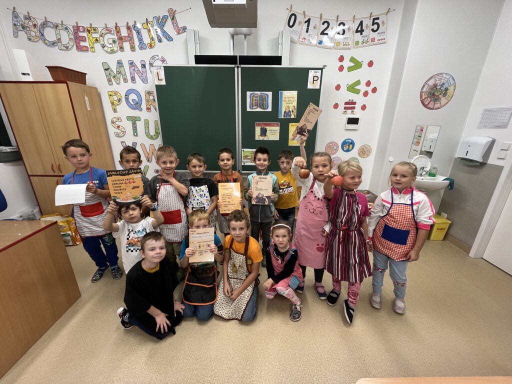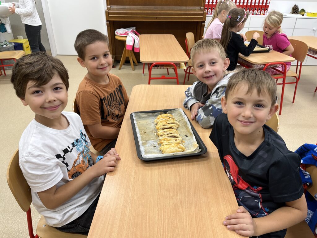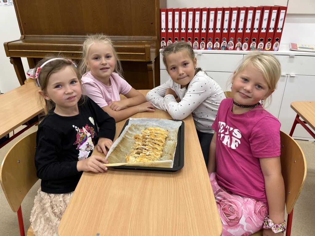 Tento týden k nám oficiálně dorazil podzim a s ním i hojnost sklizně. V první třídě jsme si společně vytvořili krásnou podzimní výstavku. Celý týden jsme důkladně zkoumali ovoce a zeleninu – porovnávali jsme jejich tvary a barvy, učili se je hláskovat a slabikovat. A protože platí, že nejlepší je učit se prožitkem, v pátek 26. 9. 2025, jsme zapojili i chuťové buňky! Z našich prvňáčků se stali malí cukráři a společně jsme si upekli voňavé dobroty, které provoněly celou školu. Vůně štrůdlu a jablečného perníku přilákala i žáky z ostatním tříd, kteří zvědavě, ale z bezpečné vzdálenosti nakukovali přes sklo do trouby.